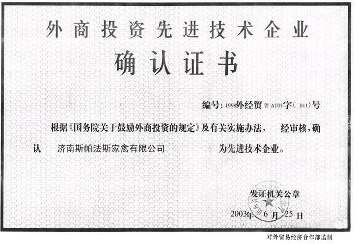 外商投资先进技术企业确认证书